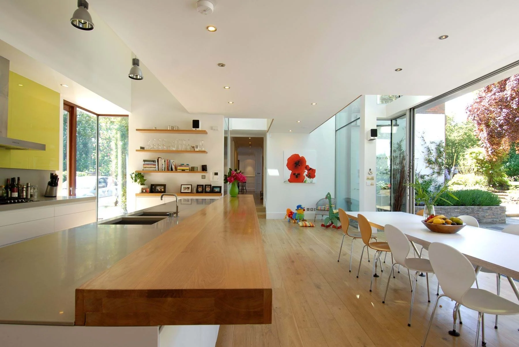 The build included full basement construction, complete structural works, timber framing, blockwork, and premium finishing throughout. The exterior features beautifully detailed Iroko slatted cladding, creating a warm, modern façade that contrasts perfectly with the original architecture.